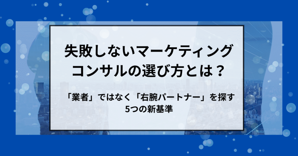 「原材料費や人件費は上がる一方なのに、安易に値上げはできない…」 「競合はどんどん新しい割引キャンペーンを打ち出してくる…」 「このまま今のやり方を続けていて、本当に未来はあるのだろうか…」 BtoC事業を経営する社長であれば、一度ならずこうした... マーケティング支援失敗しないマーケティングコンサルの選び方とは?「業者」ではなく「右腕パートナー」を探す5つの新基準