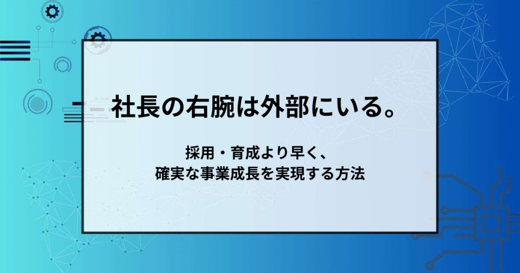 あなたは今一人で戦っていませんか? 「会社の未来を左右する重要な決断を、誰にも相談できずにいる…」 「役員や幹部には、どうしても本音を打ち明けられない…」 「家族や友人には、この重圧を到底理解してもらえない…」 会社の規模が大きくなるにつれ、経... 中小企業向け社長の右腕は外部にいる。採用・育成より早く、確実な事業成長を実現する方法