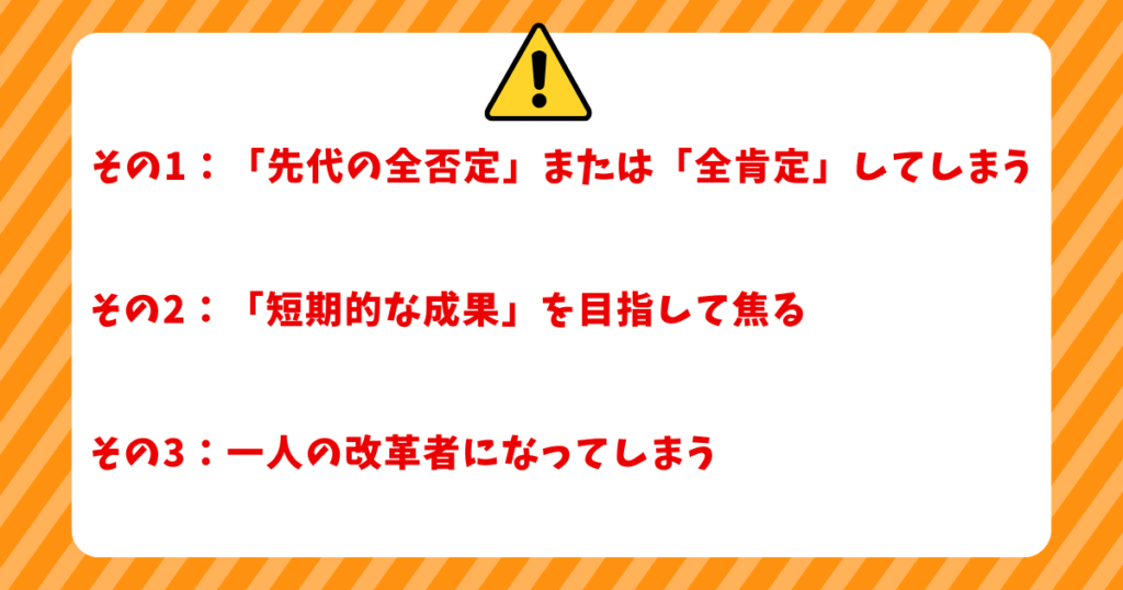 「早く成果を出して、周りを見返したい」「自分の力を証明したい」という焦りも、後継者が陥りがちな罠です。
