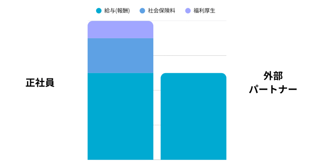 しかも、その投資が必ず成功する保証はありません。 そう考えると、必要なスキルセットを持ったプロフェッショナルを、育成期間ゼロで、かつ社会保険料などの間接コストなしで活用できる外部パートナーは、リスクを抑えつつ事業を加速させる、極めてコストパフォーマンスの高い選択肢であることがお分かりいただけると思います。