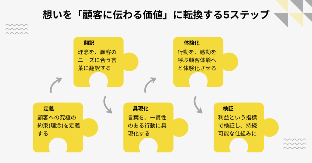 理念が利益を生むことは分かっても具体的にどうすればいいのか。ここからは、その最も重要な「HOW」について解説します。社長の熱い想いを顧客に伝わる価値へと転換し、利益に繋げるための5つのステップです。