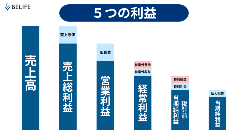 手元に残る利益には、大きく分けて5つの種類があります。これらは企業の経営成績を表す損益計算書(PL)に記載されており、それぞれ示す意味が異なります。