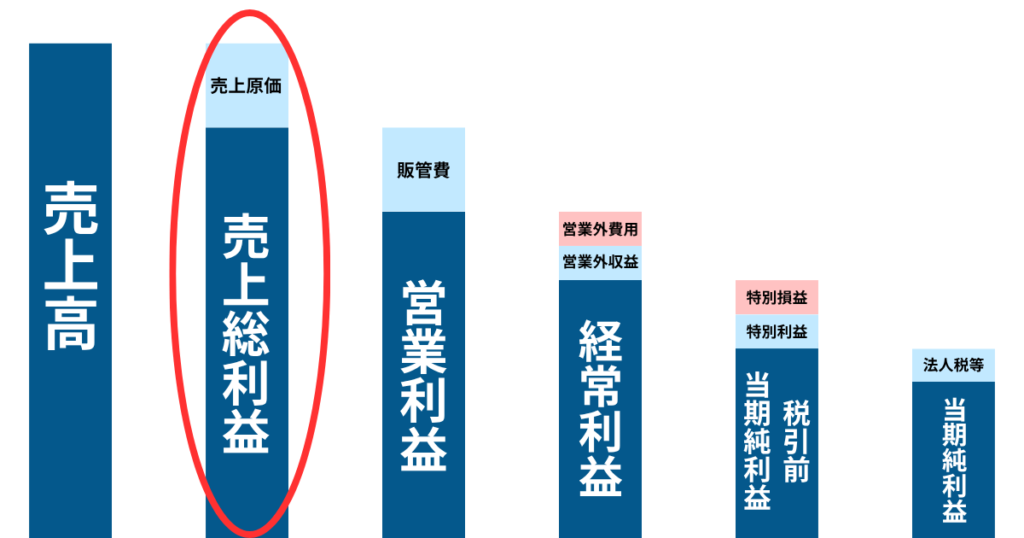 商品やサービスの販売で得た売上から、仕入れにかかった「売上原価」を差し引いた金額です。「粗利(あらり)」とも呼ばれ、その商品が生み出している付加価値を示します。